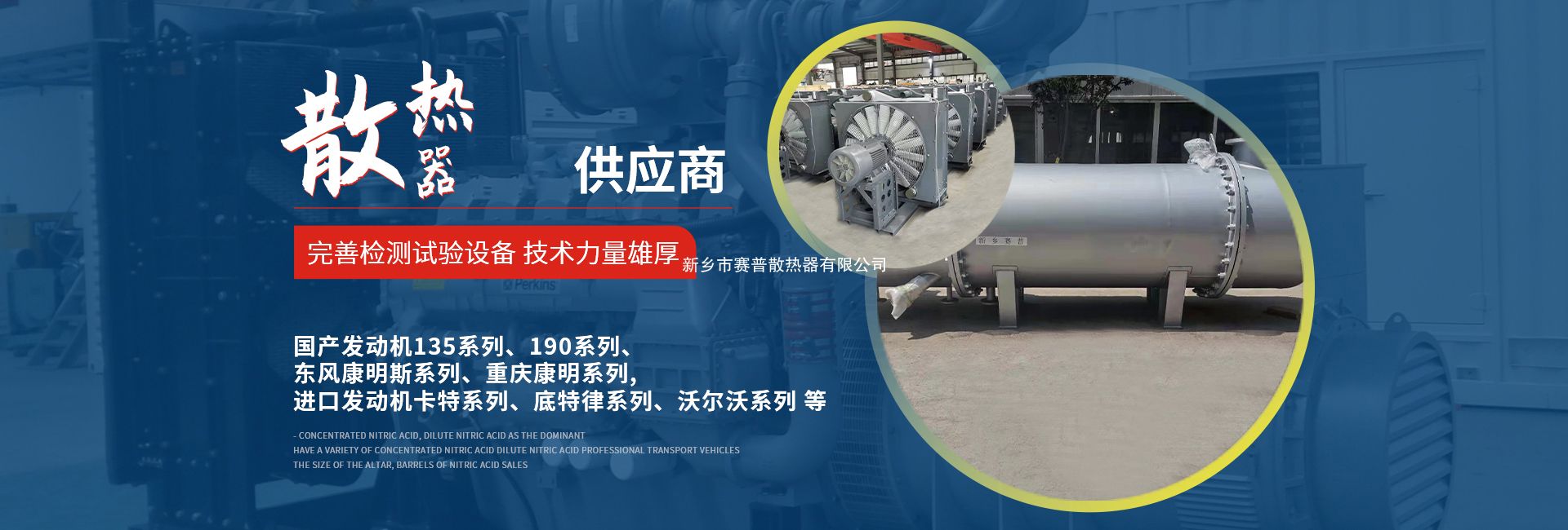 • 本公司主要產(chǎn)品有國產(chǎn)發(fā)動機系列、消防水泵專用散熱器,進口發(fā)動機卡特系列及各大工程機械有限公司配套散熱器。